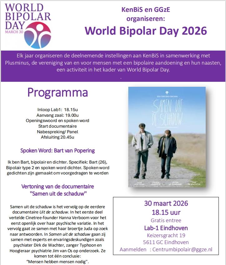 Op maandag 30 maart 2026 is het World Bipolar Day. GGzE, het Kenniscentrum Bipolaire Stoornissen en de vereniging voor mensen met een bipolaire aandoening en hun naasten, Plusminus, organiseren samen deze bijzondere avond.
